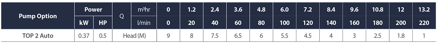 Flow rate up to 220 l/min (13.2m³/h) Head up to 9m